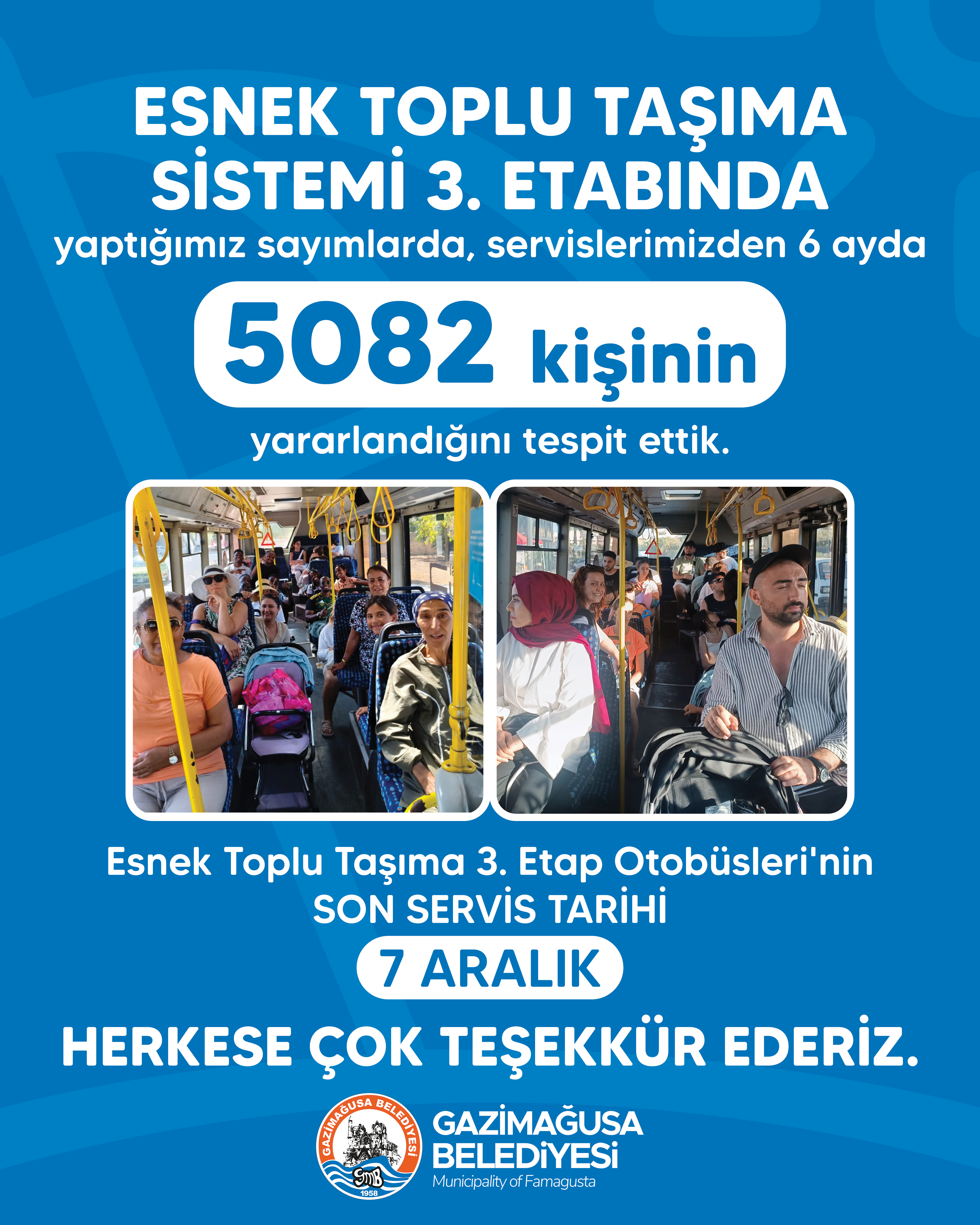 Mayıs ayında başlattığımız Esnek Toplu Taşıma 3. Etap servisleri, geçtiğimiz altı ay boyunca beş farklı rotada kesintisiz hizmet vererek kent içi ulaşımda önemli bir ihtiyacı karşıladı. Bu dönem gerçekleştirdiğimiz sayımlar sonucunda toplam 5.082 kişinin otobüs hizmetlerimizden faydalandığını tespit ettik. 3. Etap 7 Aralık’ta tamamlanırken, Ocak ayında başlayacak 4. Etap için hazırlıklarımızı sürdürüyoruz. Yeni etap planlaması, mevcut yolcu sayım raporlarının detaylı analizine göre ve belediyemizin bütçe imkânlarını en iyi değerlendirecek biçimde hazırlanıyor.